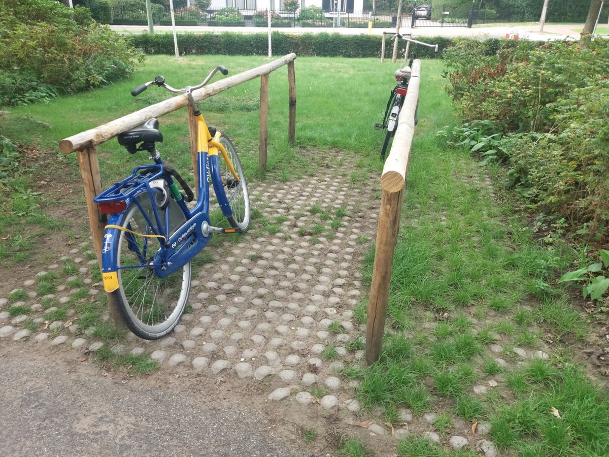De fietsenstalling voor de winkel van Vogelbescherming in Zeist is voorzien van halbestrating.