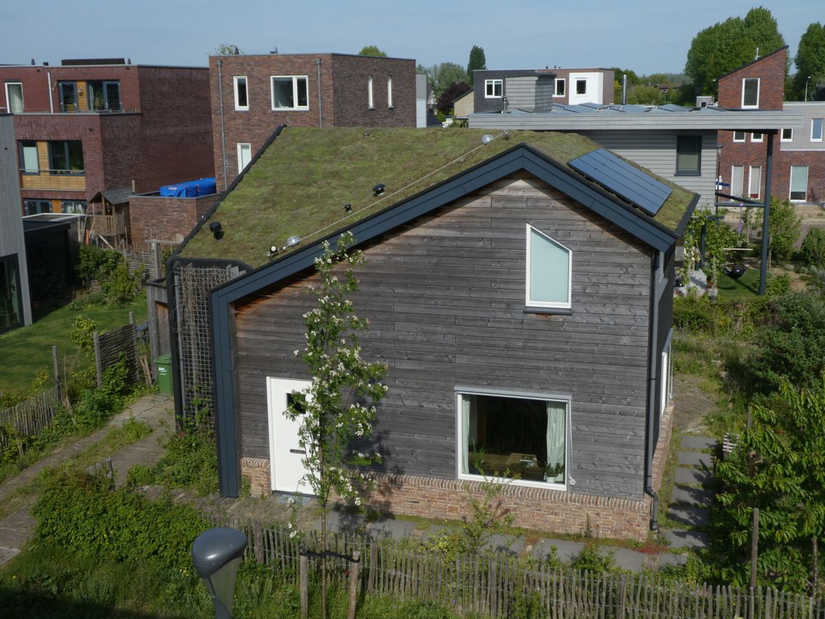 In de wijk Plantjevlag in Nijmegen Noord kun je in alle vrijheid je eigen huis ontwerpen en bouwen. Met dit huis hebben de bewoners Sanne en Peter niet alleen hun eigen droomhuis neergezet, de architect heeft er naar de wens van Sanne en Peter ook volop natuurinclusieve maatregelen in verwerkt. Ingebouwde huismussenkasten, geïntegreerde kasten voor gierzwaluwen in de dakoverstek en mee-ontworpen nestkasten voor andere vogels; juist een houten huis biedt veel mogelijkheden. Ook aan vleermuizen is gedacht; voor hen zijn ruimtes achter de gevelbetimmering gemaakt. Hier vinden sommige insecten ook een plekje. Daarnaast is er een groen dak aangelegd. Dankzij een constructie van EPDM gevelbekleding met hiervoor een rek kunnen verschillende planten langs een deel van de gevel omhoogklimmen, waardoor op die plek een groene gevel ontstaat. Als laatste is ook de tuin vanzelfsprekend natuurvriendelijk ingericht met veel ruimte voor egels, amfibieën, insecten en vogels.
